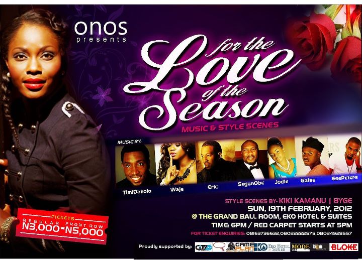 For the love of the season is a concert to celebrate the Valentine season and it is organised by Gospel act – Onos. Scheduled to attend and perform their hit tracks are Waje, Timi Dakolo, Jodie, Eric, Gaise, Segun Obey, Ese Peters and many others. Fashion labels – Kiki Kamanu and Byge will also be around to showcase their label’s collection. Comperes of the event are Julius ‘The Genius’ Agwu and Titi of Inspiration FM. There will also be comedy by MC Abbey and Jedi. For tickets Call 08163736632 | 08022222575 | 08034928557 | 08037277904