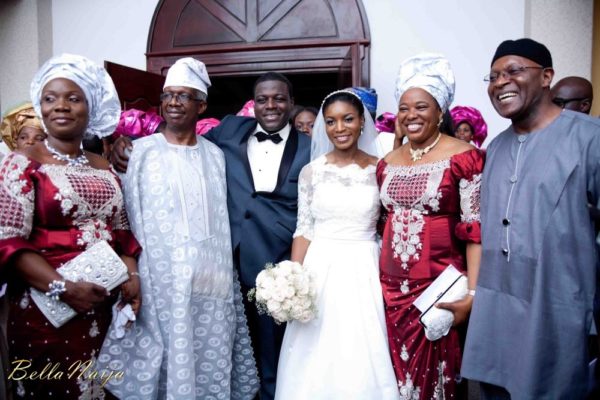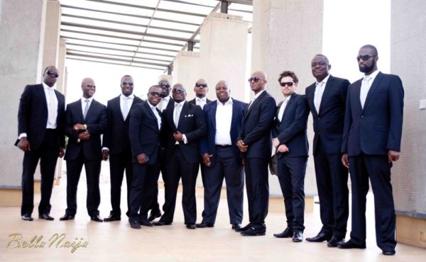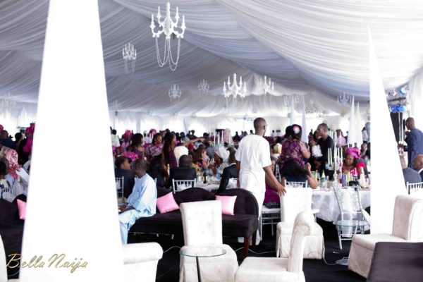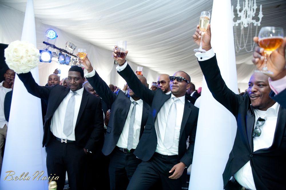 The stage was set for Amina and TJ’s white wedding in Lagos on the 21st of April 2012, the bride set the beautiful tone for the day as she stepped out in her stunning couture gown accessorized with a cathedral length lace trimmed veil and a delicate yet dazzling headband. The lace bodice,  silk duchess satin cummerbund and full circle silk satin faced organza skirt of Amina’s dress was a perfect fit for the bride as she evoked timeless Grace Kelly-esque glamour which resonated throughout the wedding. The groom TJ looked dapper in his blue tuxedo with black lapels and an elegant black bow-tie. The bridal party added pops of colour in their pink and blue lace dresses while the groomsmen kept things sleek in their black suits.