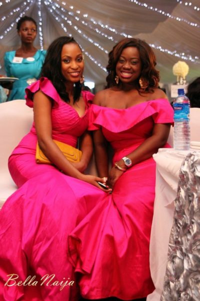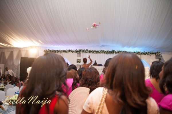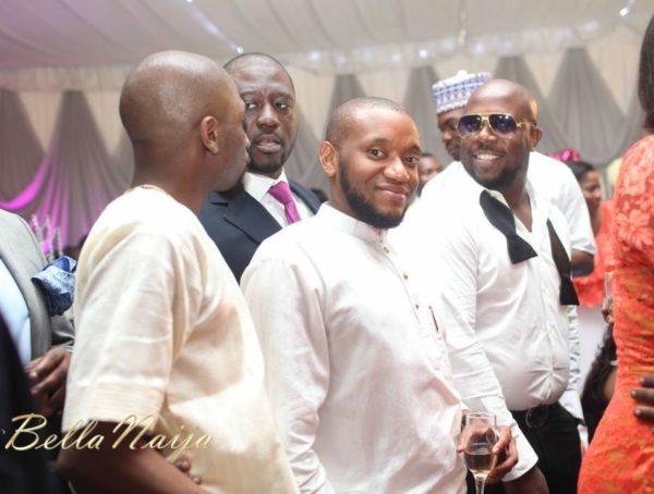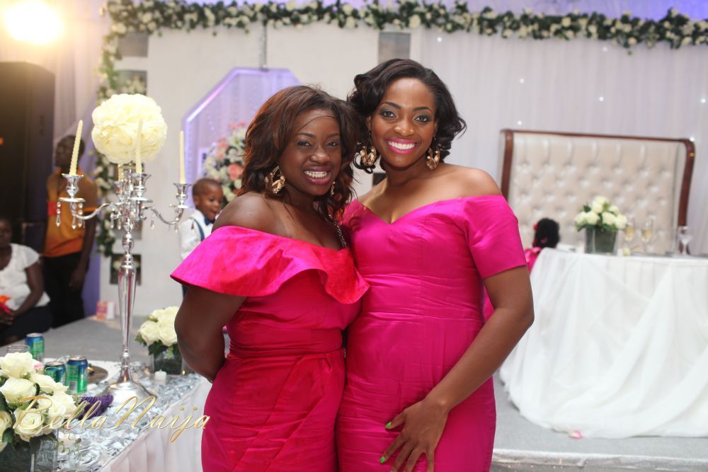 Beautiful does not adequately describe the bride Funke on her wedding day…she was stunning in her draped asymmetric sheath dress. With her hair perfectly coiffed then accessorized with a hairpiece which matched her earrings and elegant lace veil, Funke completed her stylish bridal look. As expected, the bridal party made a style statement in their fuchsia pink and coral dresses by the bride’s design label, Phunk Afrique. The groom, Ayotunde was handsome in his three-piece grey suit paired with a dark pink paisley print tie. His groomsmen complemented the bridesmaids in their black suits with fuchsia ties.