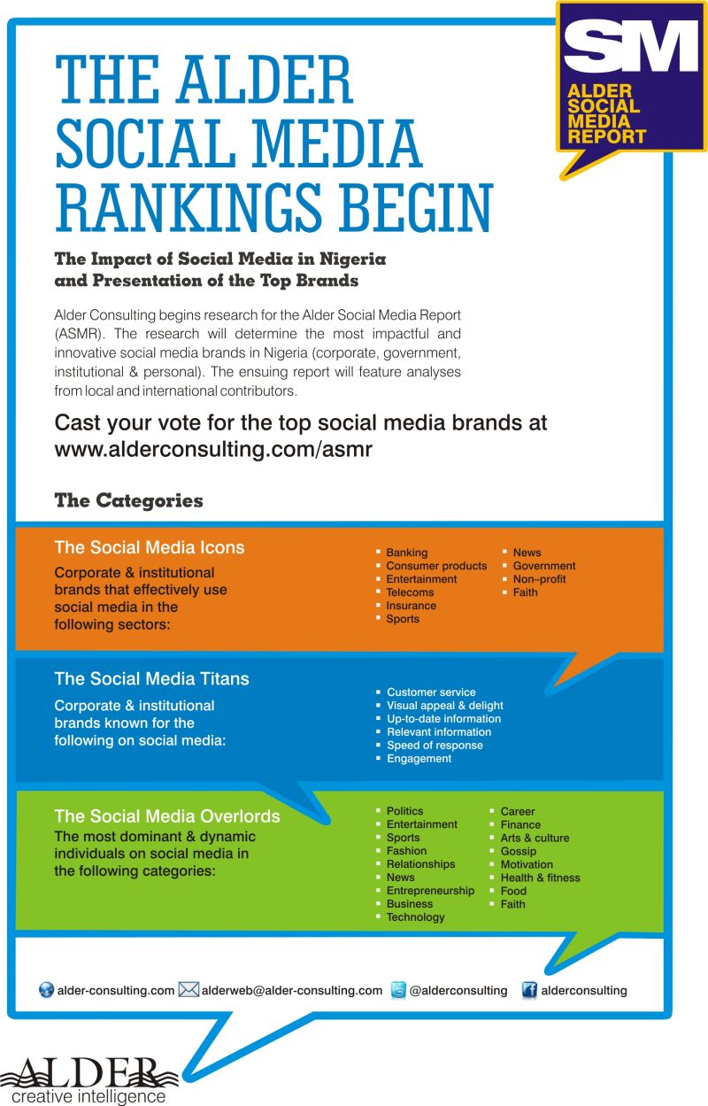 The Alder Social Media Rankings - BellaNaija - October 2013 Alder Consulting, the Creative Intelligence Company is set to introduce another landmark report – the Alder Social Media Report (ASMR). This media report is a presentation of Nigeria’s most impacting and innovative social media brands (corporate, government, institutional and personal).
