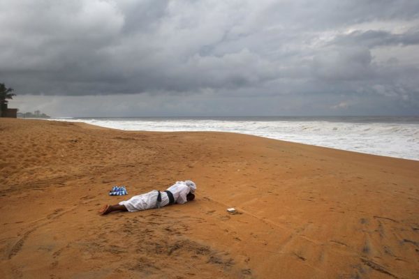 A man reads scripture on the beach on August 20, 2014 in Monrovia, Liberia. He and other church members said they were praying for God to rescue Liberia from its current crisis.