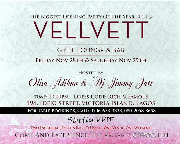 The Vellvett Grill Lounge & Bar is about to open and will be having a grand opening party tomorrow – Friday 28th November 2014. This event will be hosted by Olisa Adibua & the Cool DJ Jimmy Jatt.