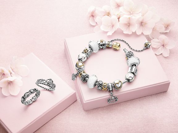 Examples of PANDORA’s exclusive and feminine jewelry, that including bracelets, rings, earrings and necklaces