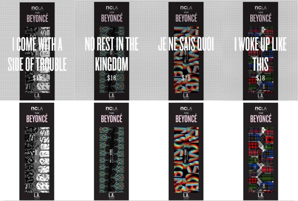 The Queen B just released a line of nail wraps that she created in collaboration with NCLA Los Angeles. The collection features 4 amazing designs inspired by her visual album. They have the names ‘Je Ne Sais Quoi’, ‘I Come with A Side of Trouble’, ‘No Rest in the Kingdom’ & ‘I Woke Up Like This’, all selling for $18 (Approximately N3,239).