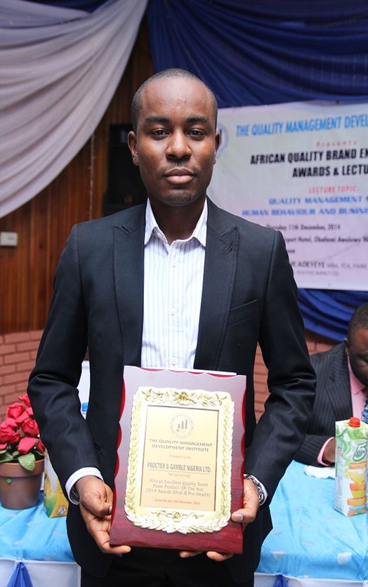 The organizer of the award presented the award to the Assistant Brand Manager Oral B, Afolarin Ojo, on behalf of the manufacturer of Oral B, Procter and Gamble Nigeria.