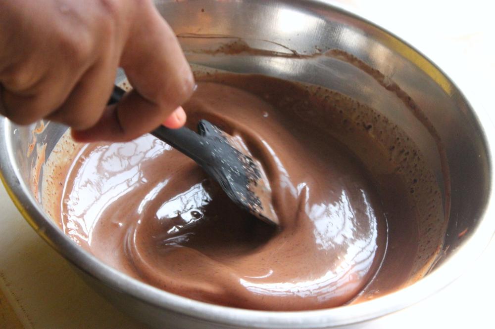 Once you see the chocolate melting slowly, with a spatula move the chocolate around and once melted totally take off the heat and add the sugar and honey and stir.