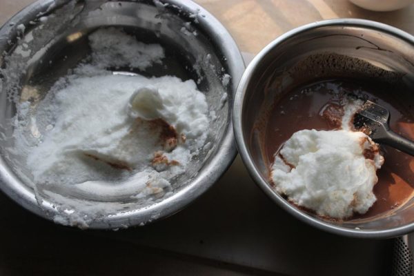 Make sure your chocolate mixture is very cool then fold in the egg whites. Put in half of the egg whites stir it in. Then the other half gently coax it into the chocolate mixture.