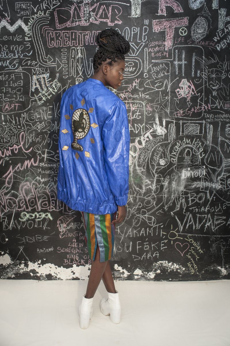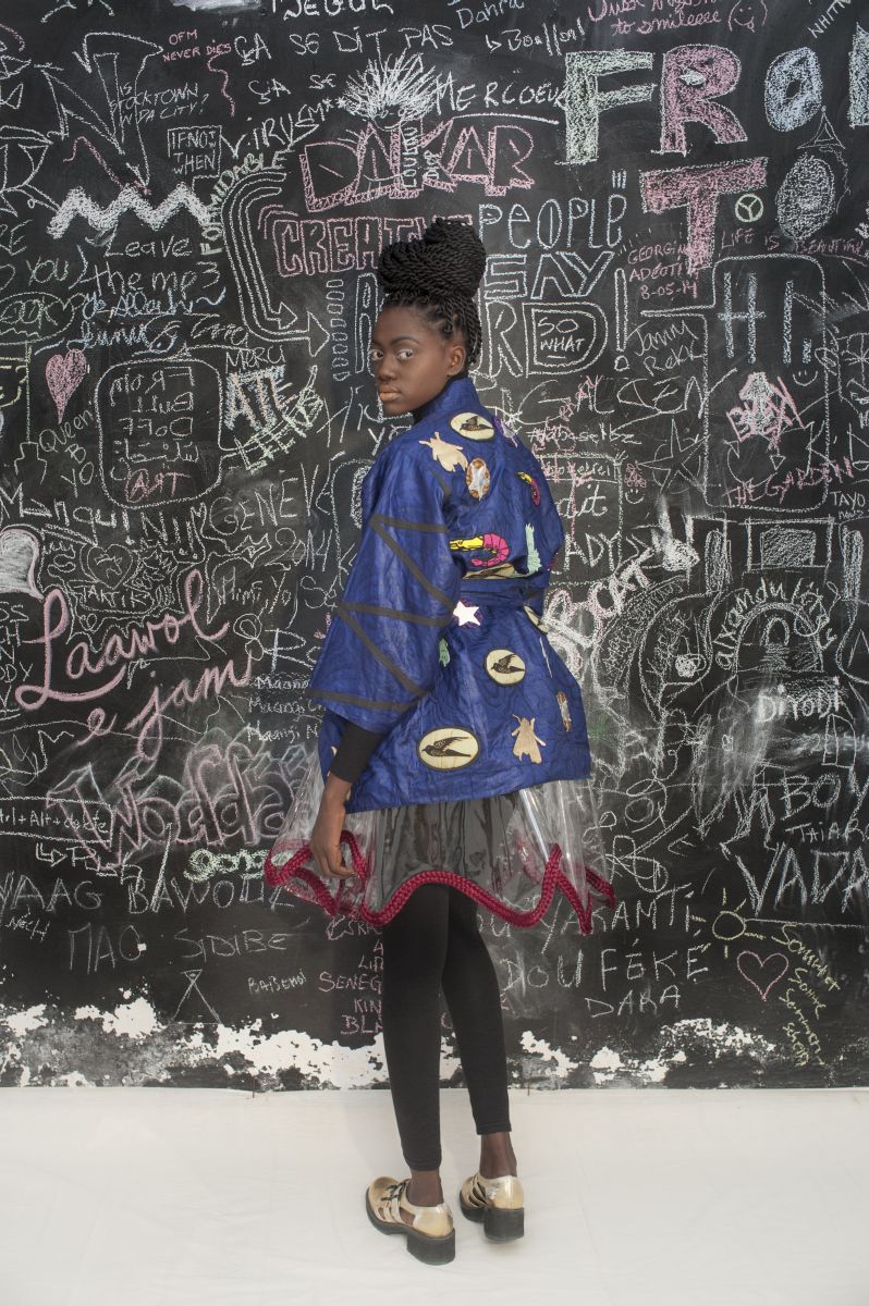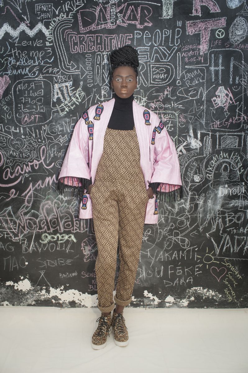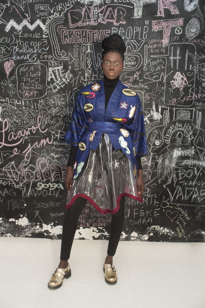The kimonos are embellished with classic quilted wax prints, with shrimps and parrots while the sweaters are patched in a Senegalese ‘bayefall’ style.