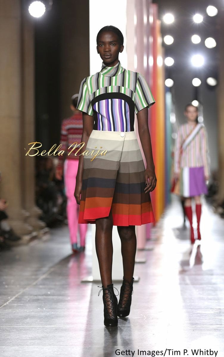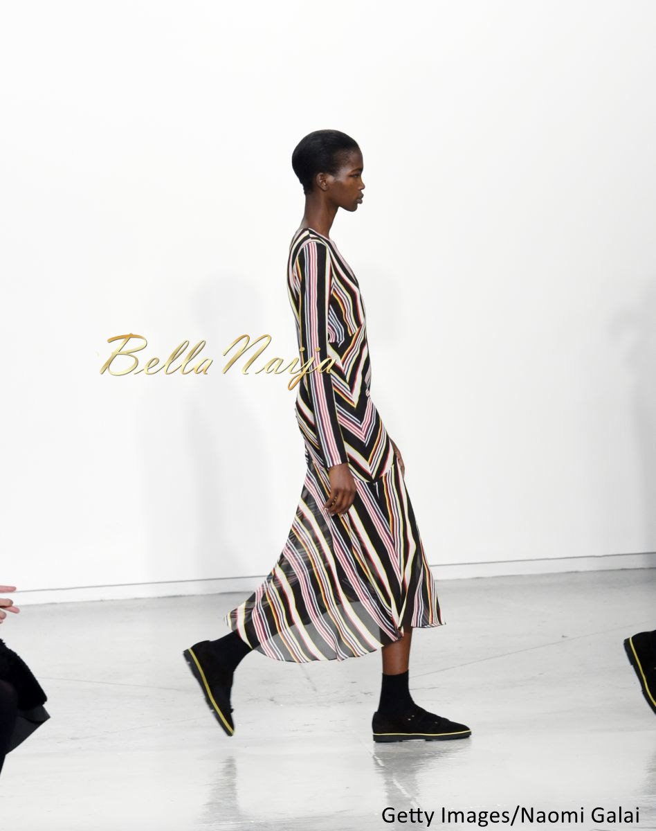 Aamito also walked the Fall 2015 runway show for Suno. Wearing a striped dress with a V-neck, her look was very 70s with a soft and feminine silhouette.