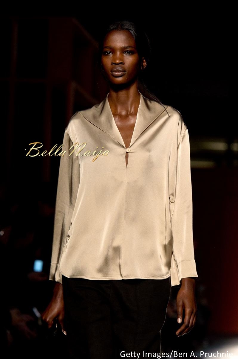The Paul Smith runway was a celebrated mash-up of chic and classy pieces mixed with a modern and sophisticated appeal. Aamito hit the runway in a flowing silk blouse with a mini-cape neckline and slightly over-sized dark trousers.