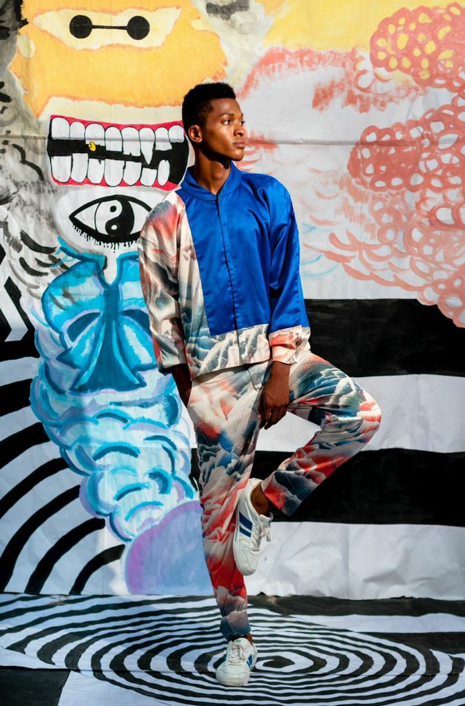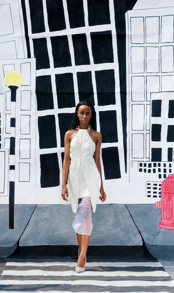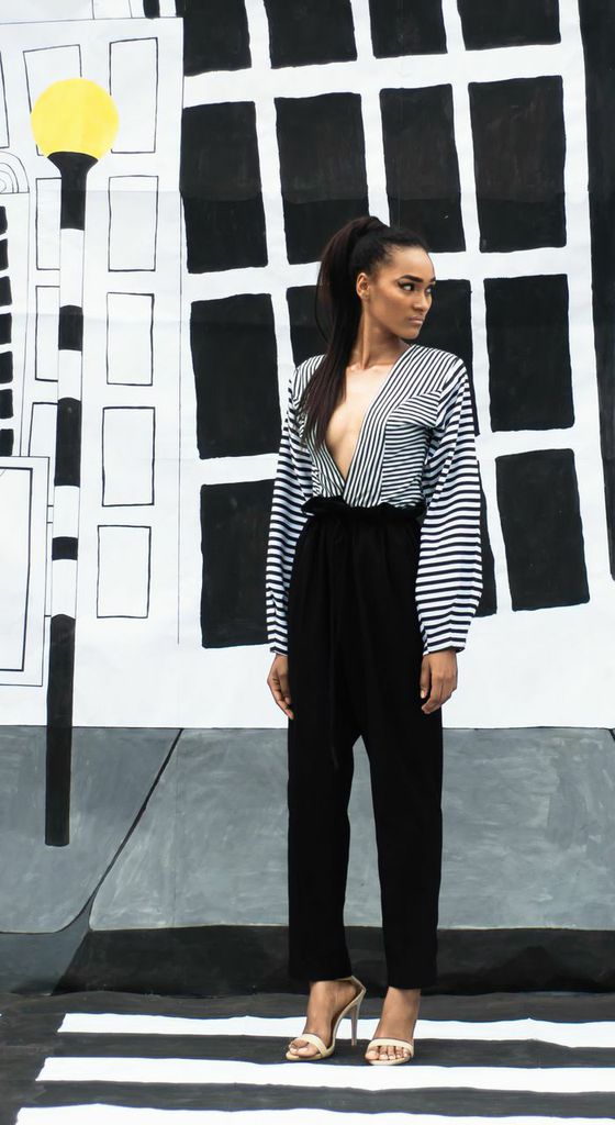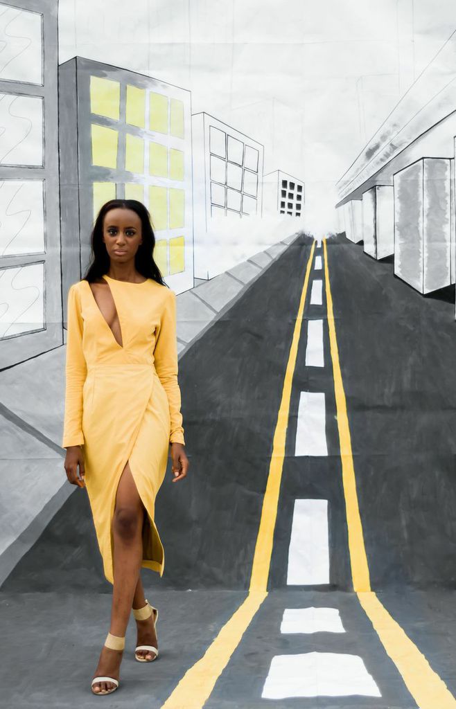 With paintings by his twin brother – Fred Aghuno who is a artist and painted all 3 backdrops, the collection materializes colour, prints and patterns. “Bastille” has pieces in organza, chiffon, silk-cotton and satin with Spring colours like peach, mustard, champagne, white, blue and black. We love the cut-outs, thigh-high slits, asymmetrical and structured sleeves.