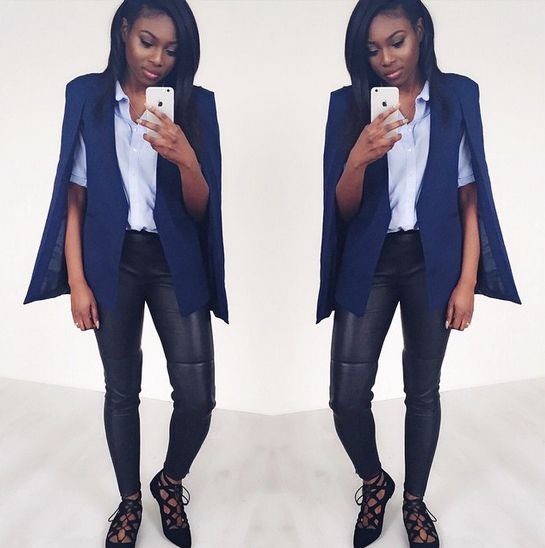 The stylish cape jacket isn’t just for looking chic on the streets, you can also rock it to work. It has a way of adding class to your look which works great for Monday mornings or even to close up shop on Fridays.
