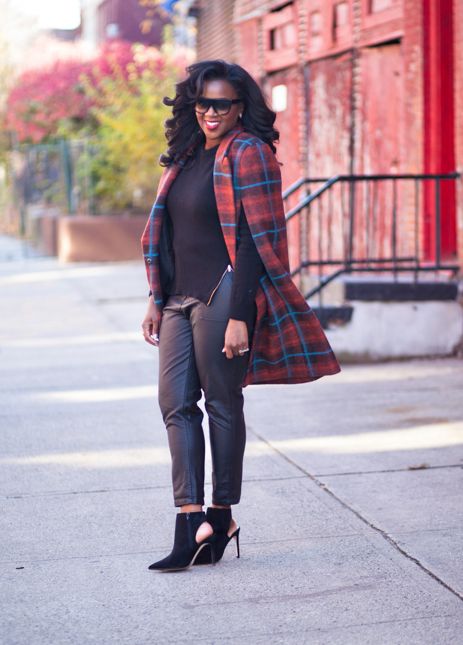 Take a stylish cue from Kela of KelasKloset.com in her black floral print cape coat and lifestyle vlogger Patricia Bright of MomentsofStyle with her official spin with a short-sleeved shirt and leather pants.