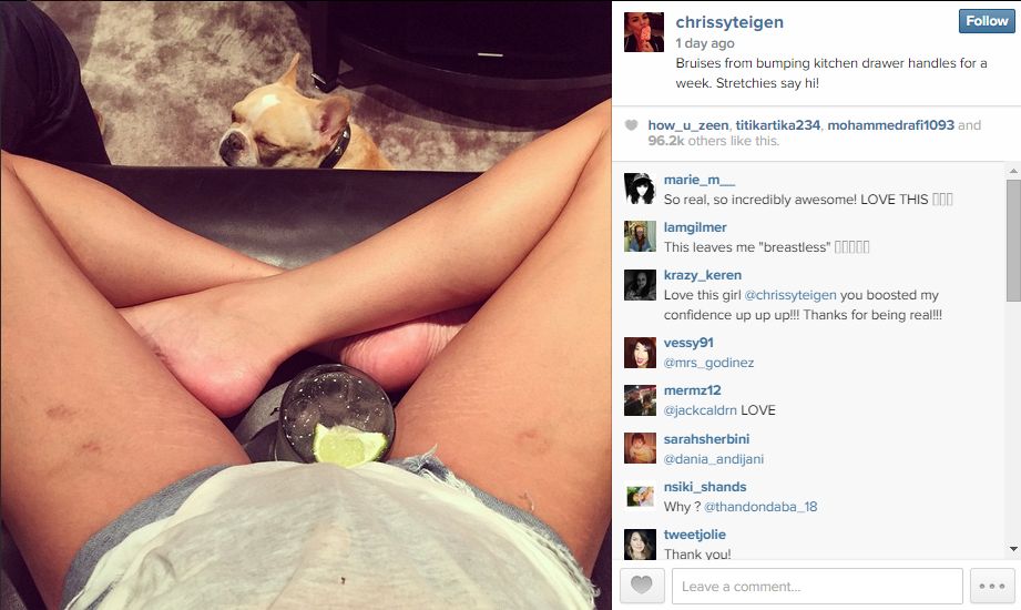 – “Wow, this makes me feel so much better about my legs. I hate the stretch marks on my thighs. Thanks for keeping it real @ChrissyTeigen you are so gorgeous. I never would have guessed you have flaws like the rest of us gals. #GirlPower #StrongWoman“