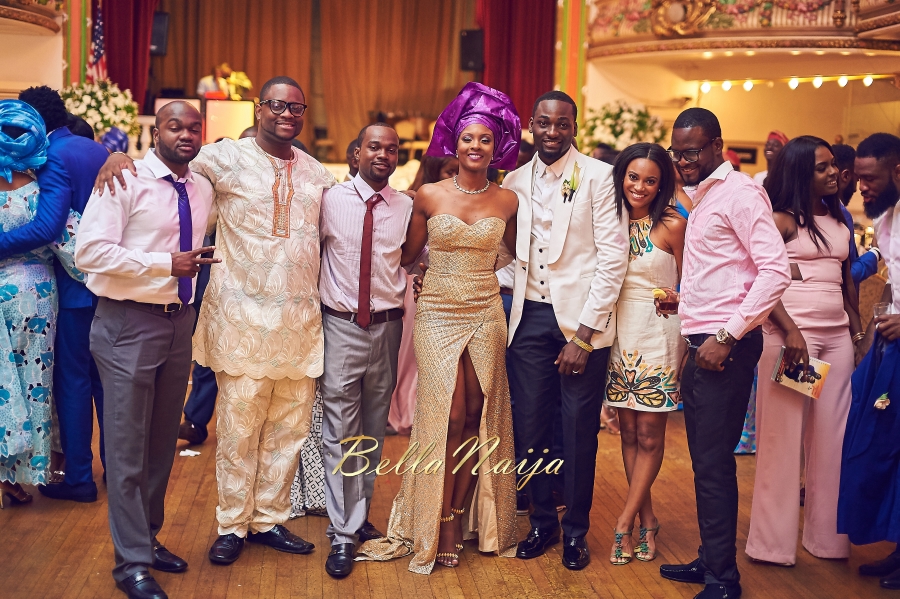 In a big step, the groom Gbenro cut off his signature locks for the white wedding at The Grand Prospect Hall, Brooklyn! Osas looked beautiful in her three dresses, all by Nigerian designers. Mai Atafo, who also made the groom and groomsmen suits and her bridesmaids dresses, Andrea Iyamah for the mermaid reception dress, and Toju Foyeh for the gold strapless gown with a thigh high slit.