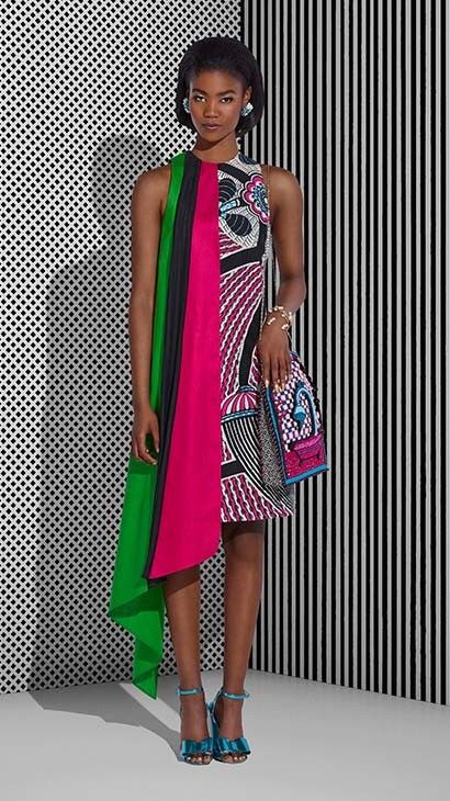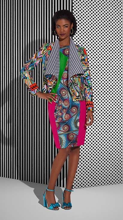 The pieces from the Dutch Wax brand, which include ankara prints, bold hues in pink, green, purple, blue and gold, are placed against a contrasting black & white wall.