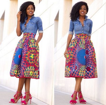 If there’s one thing I love about Folake Huntoon of Style Pantry, it’s her ability to mix and match fabrics from different worlds. She paired her pretty pink tassel lace-up heels with a bold print ankara midi-skirt and a denim shirt.