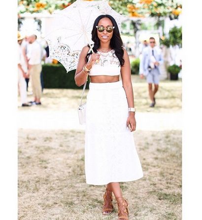 See how Shiona Turini of Shionat rocked her brown short heel lace-ups with a white cropped top and a fun midi-skirt, to a Verve Cliquot Polo Classic event.