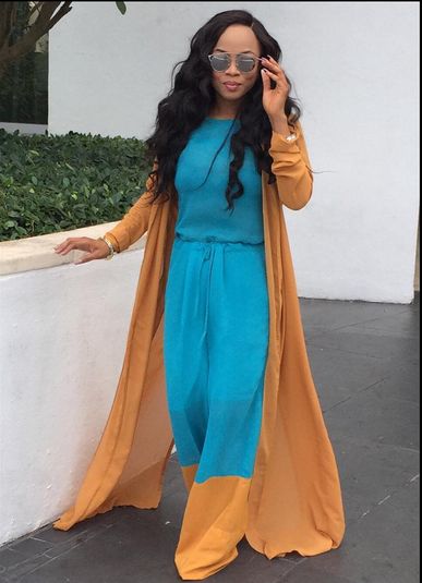On a recent trip to Miami, TV & radio personality – Toke Makinwa rocked this outfit as she headed to New York City. Toke ditched the blue kimono and went for a pop of colour with its orange alternative. She paired her Wana Sambo set with flats (very travel appropriate), gold accessories and stunning shades.