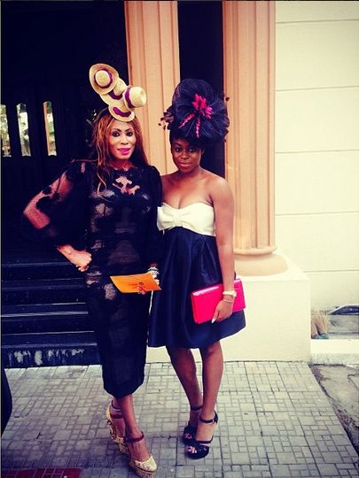Both ladies made a bold statement with their choice of hats for a daytime event. Zina looks very girly in her strapless dress, and Nkiru is quite svelte in a lace black dress and platform shoes.