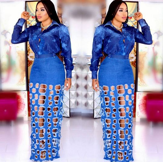 The outfit included a skirt with distressed cut-outs, paired with a soft denim button-up shirt and gold accessories.