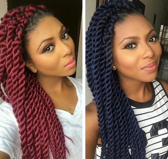 Can you help out? Which colour of braids do you think she looks better in – wine or blue?