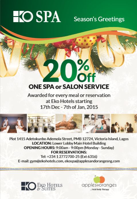 You can get a whopping 20% off a pampering, relaxing or hairdo session with your meal or reservation at Eko Hotels.