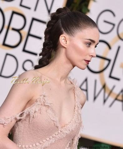 Rooney kept her beauty look simple and pretty with her hair sleeked back into a braided ponytail, dark berry lipstick, and a lightly blushed face.