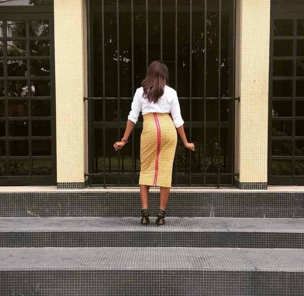 Showing us just how fabulous she is, TV personality Dolapo Sijuwade rocks a signature piece from the collection. The piece is an ankara skirt, complete with mixed prints. Dolapo styled the skirt with a pristine white shirt, and fabulous black heels.