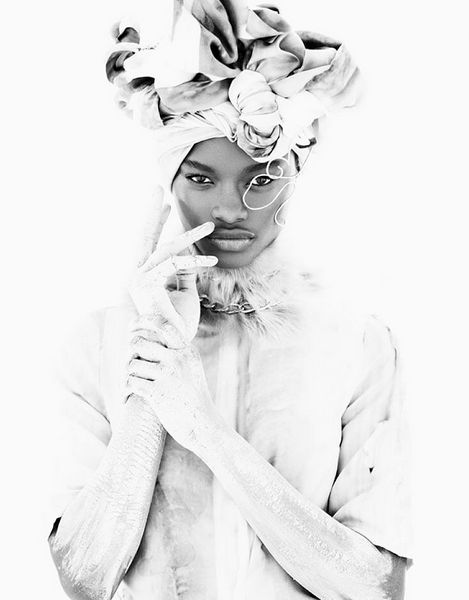 The images, taken by Paul Morel in black & white, with styling by Adele Cany and makeup by Virginie Rascle, show Mayowa as an icy beauty with tribal accents achieved with the inclusion of dead leaves & sticks made into a crown, head pieces and body paint.