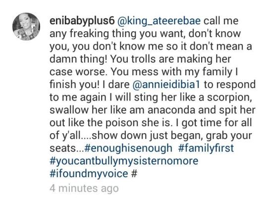 Eniola made several accusations, which have since been deleted from Annie’s page, but not before Annie told her to get off her page.