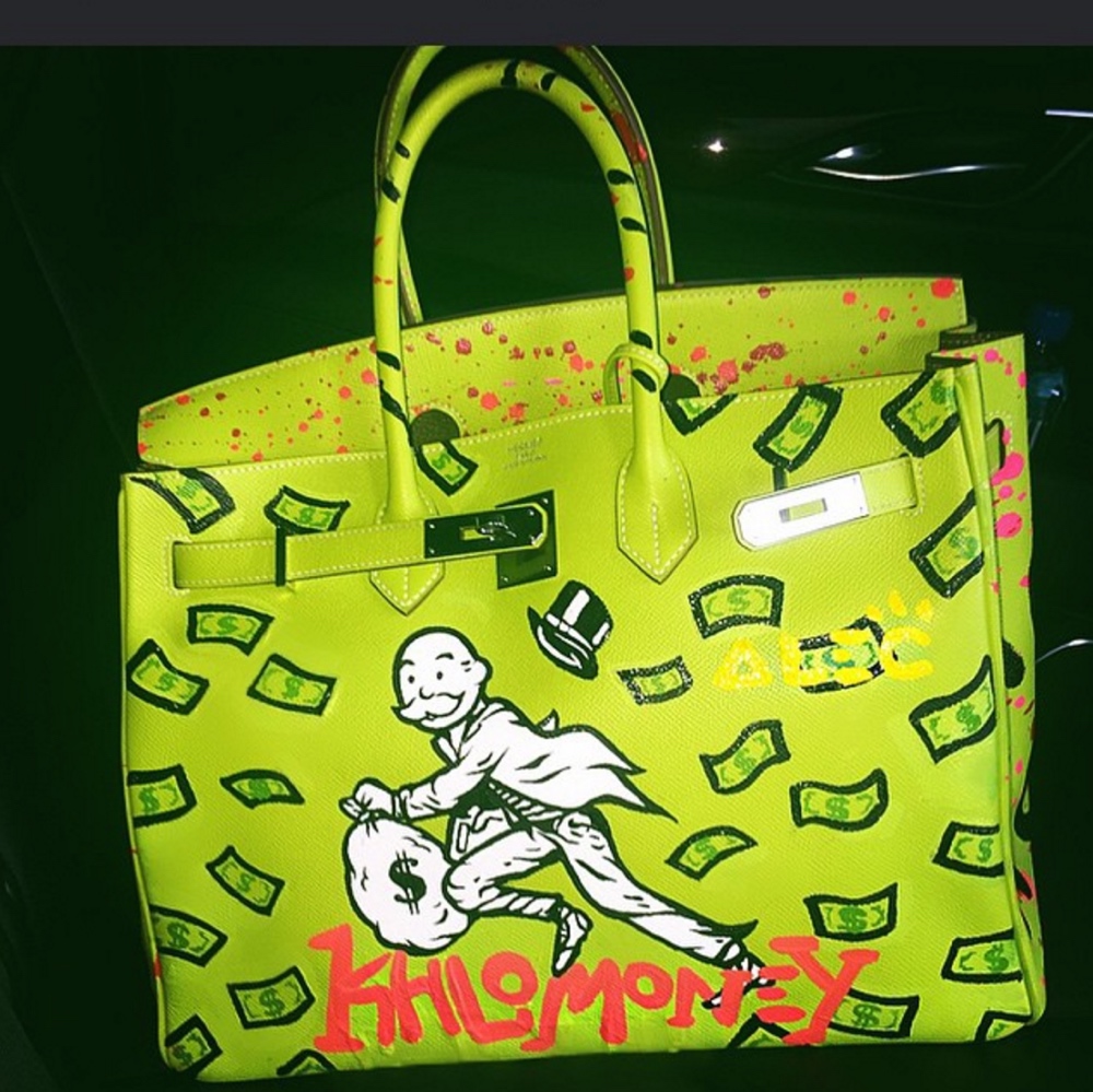 Khloe Kardashian also had a customised neon green Birkin with the Monopoly game mascot on it and her nickname ‘Khlomoney’ by artist, Alec Monopoly.