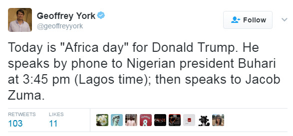 According to York, “Today is “Africa day” for Donald Trump. He speaks by phone to Nigerian president Buhari at 3:45 pm (Lagos time); then speaks to Jacob Zuma.”