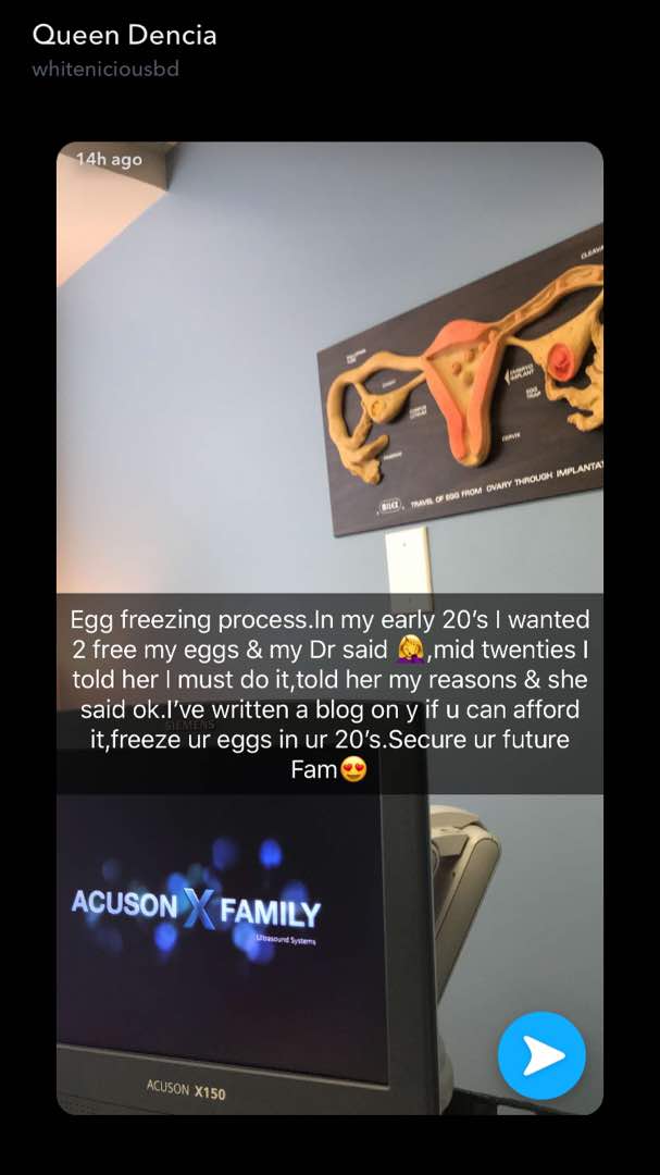 The singer took to her snapchat to share shots of her in the doctors office in the process of freezing her eggs.