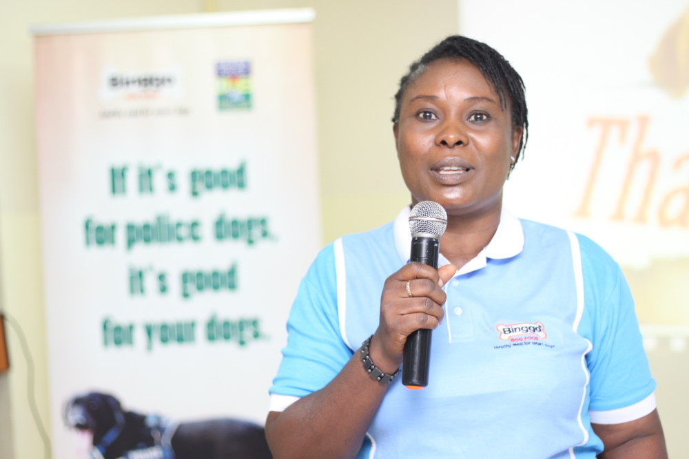 Marketing Development Manager (Binggo), Grand Cereals Limited, Evangeline Walters giving a speech at the Binggo Dog Food Breeders’ Forum.