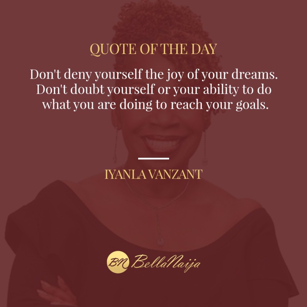 Sweet Spot #BNQuoteoftheDay Published 7 years ago on August 27, 2018 By BellaNaija.com Today’s Quote of the Day is by Iyanla Vanzant. Don’t deny yourself the joy of your dreams. Don’t doubt yourself or your ability to do what you are doing to reach your goals. Related Topics:Be Inspired!BN Quote Of The DayInspired!Iyanla Vanzant Up Next How #BellaNaijaMCM Muhammad Abdullahi is Turning Waste to Wealth with eTrash2Cash Don't Miss BN Sweet Spot: This Father/Daughter Photoshoot is too Cute! ? BellaNaija.com Living & Celebrating the African Dream! Catch all the Scoop on www.bellanaija.com Follow us Twitter: @bellanaija Facebook: @bellanaija Instagram: @bellanaijaonline You may like Smart Emmanuel: In Pursuit of Meaningful Work Deborah of #Slum2School Initiative is Now a Secondary School Graduate ? “I came out of prison a reformed man”: Onius Nzeve Makes a Living Crafting Miniature Trucks & Tractors