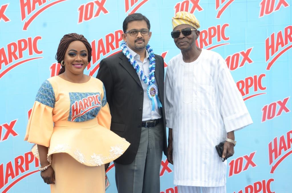 L-R: Brand Ambassador, Helen Paul; General Manager, RB West Africa, Dayanand Sriram and Toilet Operator, Omotunde Adenekan.