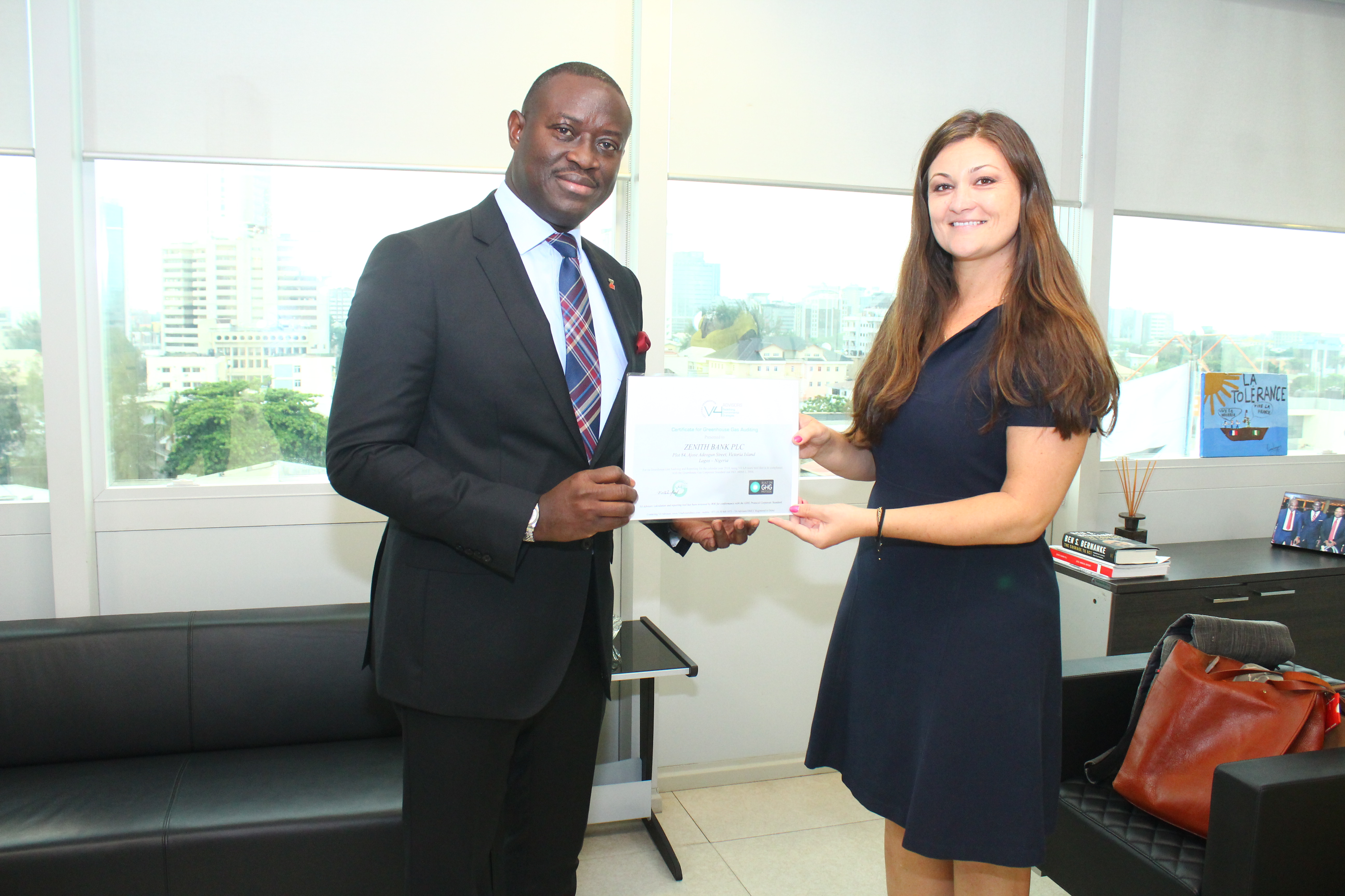 Zenith Bank was presented with a Certificate for Greenhouse Gas Auditing by V4 Advisors after successful completion of the Bank’s Greenhouse Gas Audit for the 2018 Financial Year. The presentation of the certificate and the report of the Auditors was done by V4 Advisors at the Zenith Bank Head Office on May 21, 2019.