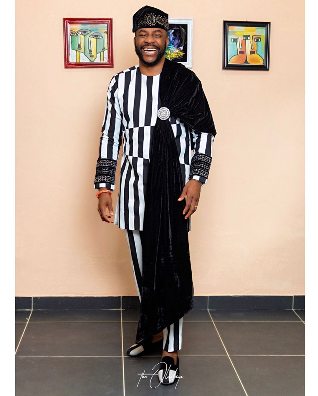 This week was no different. While hosting the live eviction show, Ebuka donned on an Ugo Monye monochrome fit. Ebuka took it a step further as he paired the black and white striped fit with a pair of black and white loafers complete with velvet embellishments and a traditional cap. He finished the look with a velvet cape – which we feel he could have done without even though it does come together to elevate the look.