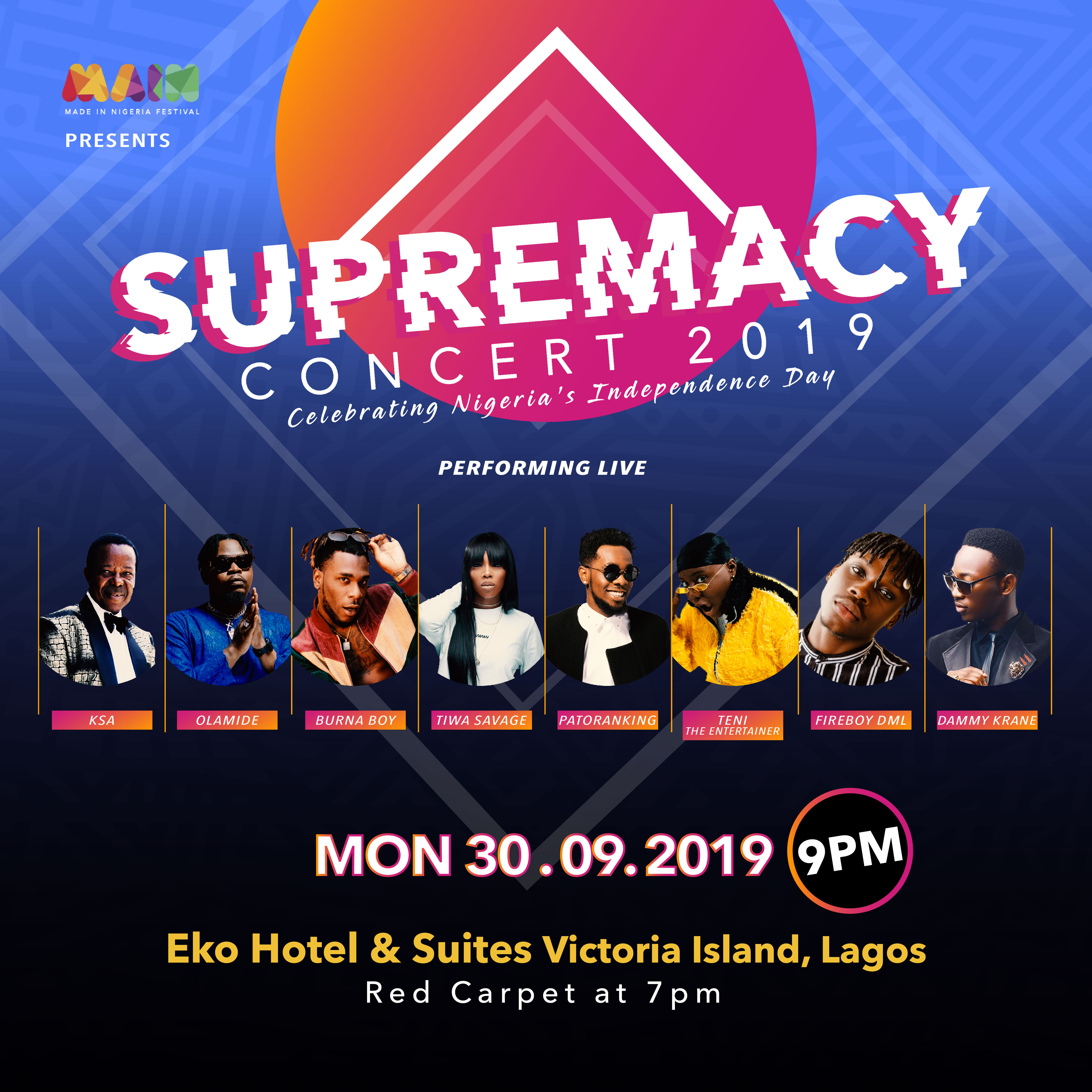 Made in Nigeria Festival presents the 2019 edition of the biggest Independence Day Concert. The Supremacy Concert will hold on September 30th at the Eko Convention Centre. Attendees will be thrilled by music performances featuring King Sunny Ade, Burna Boy, Olamide, Teni the Entertainer, Fireboy DML, Tiwa Savage, Patoranking, Dammy Krane and many more.