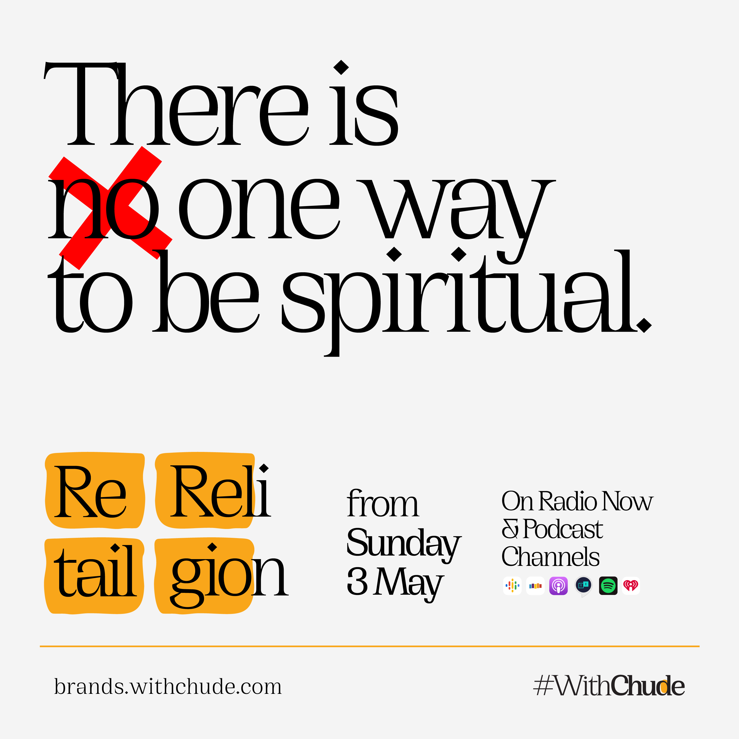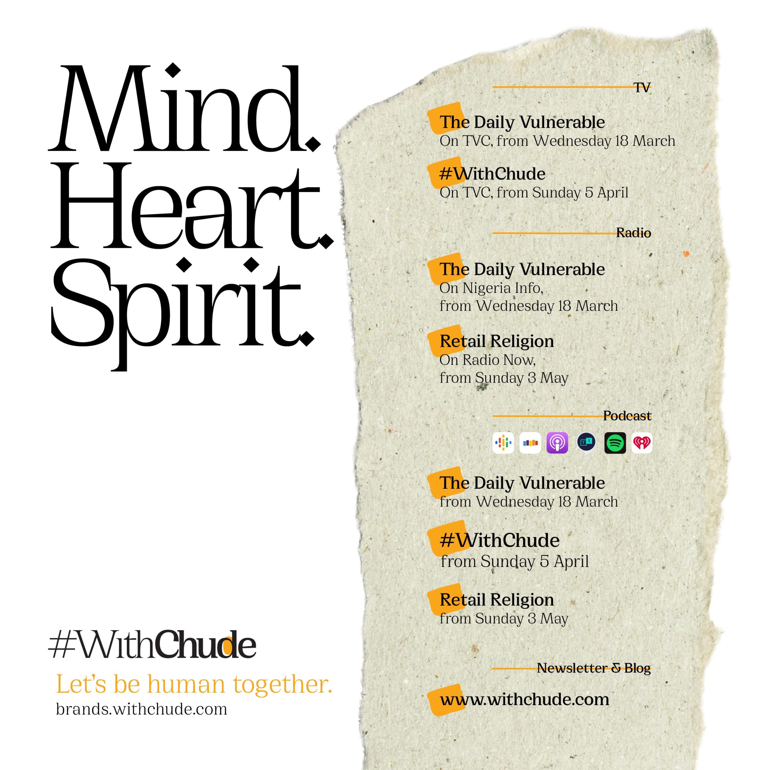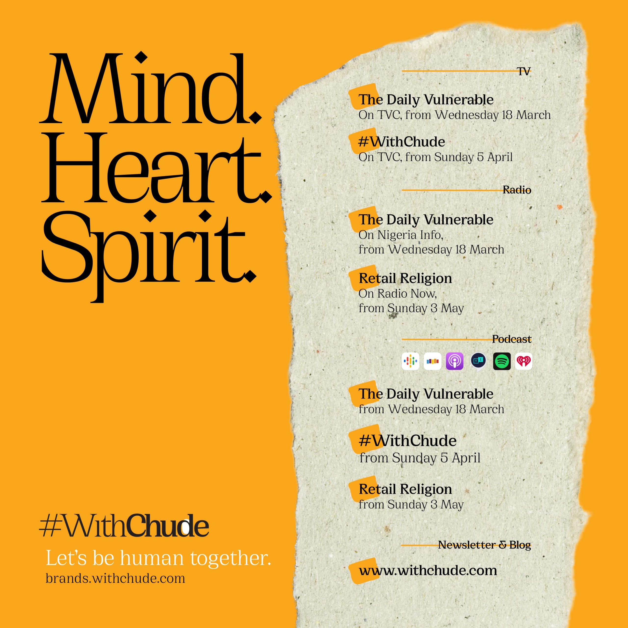 #WithChude will kick off on TVC and podcast platforms from Sunday, April 5th, 2020. The Daily Vulnerable will run daily from Wednesday, March 18th, 2020, on TVC, Nigerian Info and across all major podcast platforms. Retail Religion will air on Radio Now and accessible as a podcast from Sunday, May 3rd, 2020.