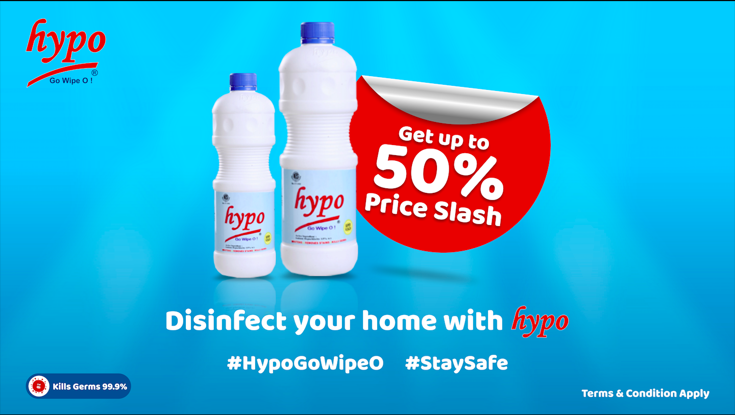 Following real-time updates and social advice from NCDC and Lagos state ministry of health to observe self-isolation and hygiene precautions to curtail the increasing cases of COVID-19 in Nigeria, Hypo Homecare Products, makers of one of Nigerian most preferred bleach has likewise on a social responsibility initiative committed to a nationwide price slash by up to fifty percent on Hypo bleach bottle units in order to encourage product pick up and usage for a safer & well-disinfected environment. The management considers this a responsible move and a public supportive measure to further restrain the pandemic surge.