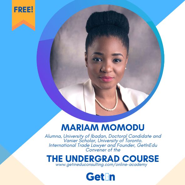 Mariam Momodu LL.M (Cantab.): Alumna, University of Ibadan, Doctoral Candidate, and Vanier Scholar University of Toronto Faculty of Law. International Trade Lawyer and Founder of GetIn Education Consulting.