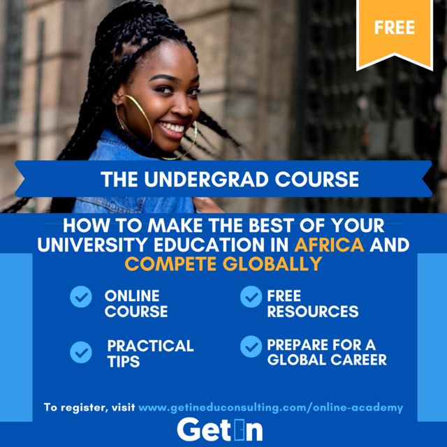 Are you a student in a developing African country who wants to access global opportunities? Are you unable to access key learning resources or are you stuck with an old curriculum unfit for the 21st century? Do you want to expand your options upon graduation? Register for GetIn Education Consulting’s The Undergrad Course to learn practical tools and strategies for maximizing your undergrad experience and preparing for global relevance!