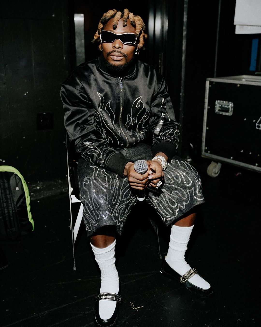 For his stage performance, the multi-award winning artiste switched into a luxe 2-piece featuring an embellished black bomber jacket and shorts paired with Michael Jackon-style white socks and black loafers, bougie goggles and stunning jewellery, see below: