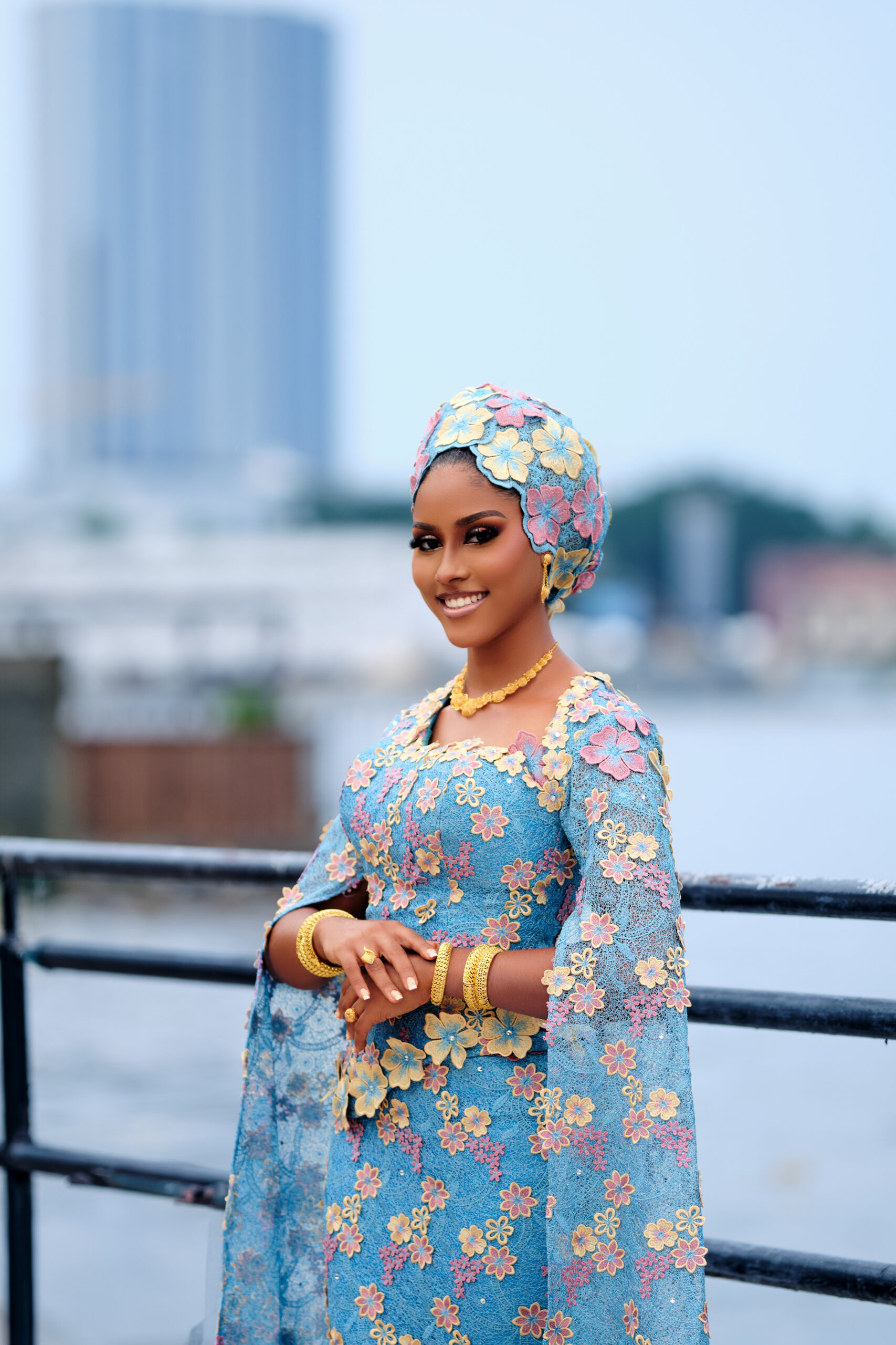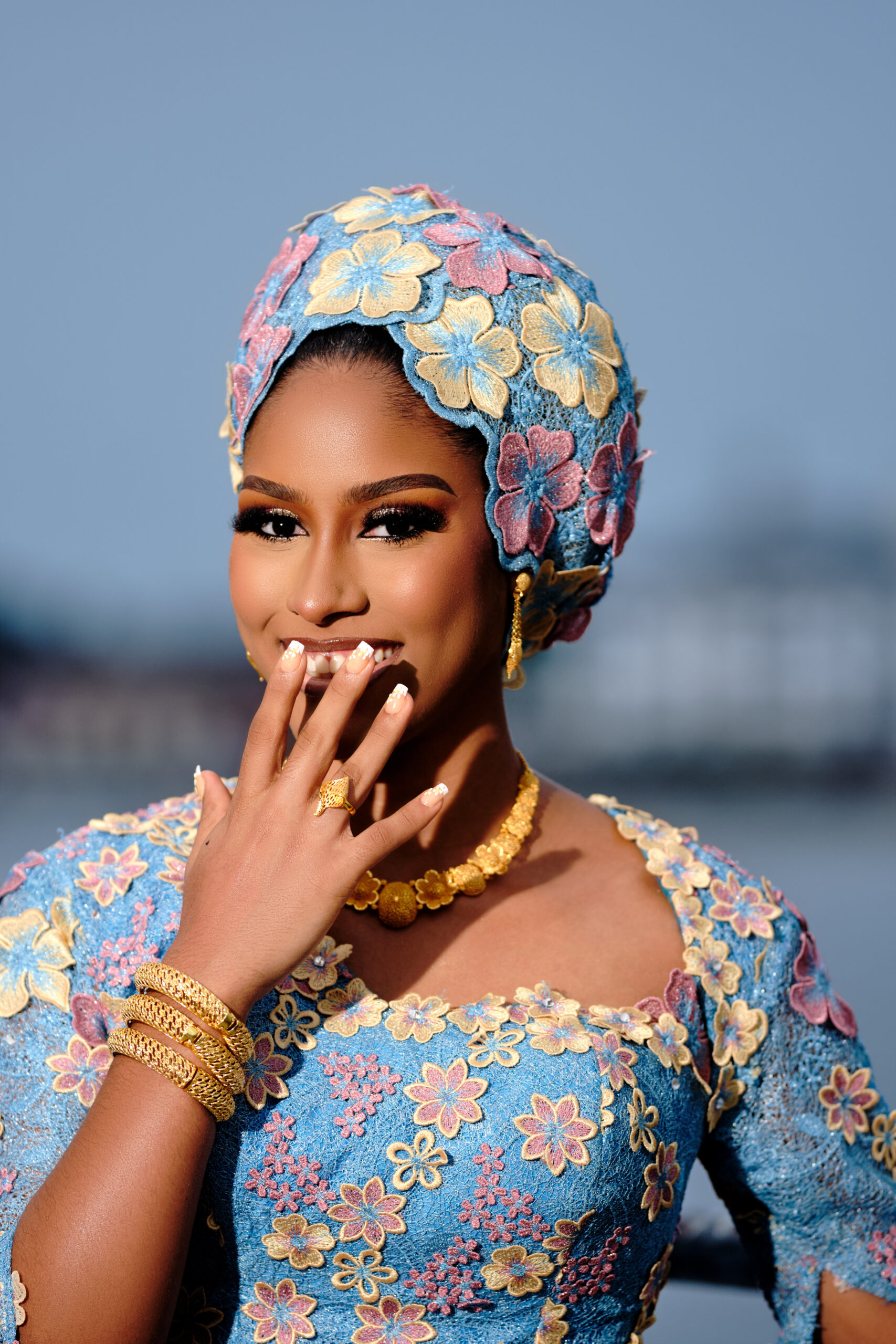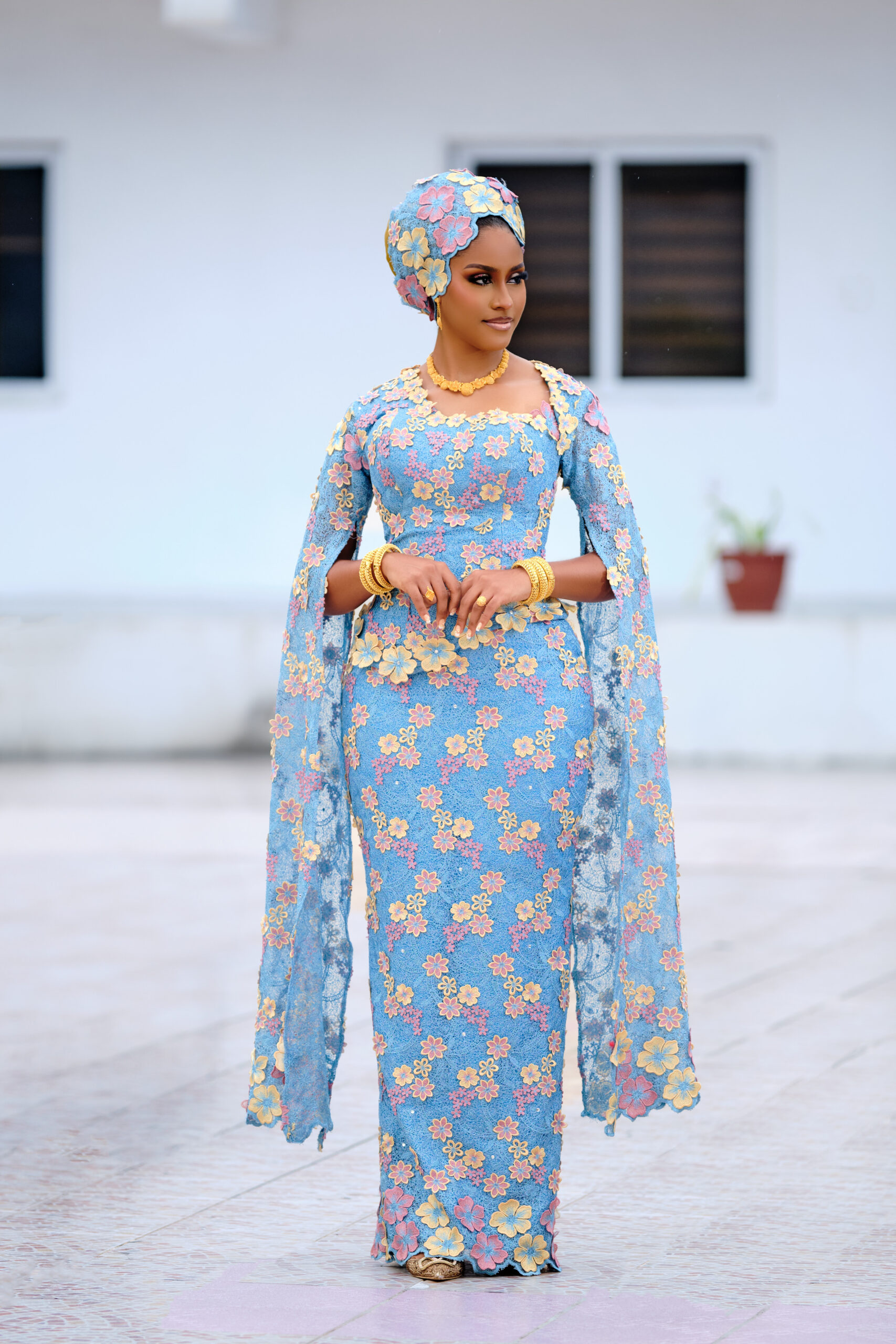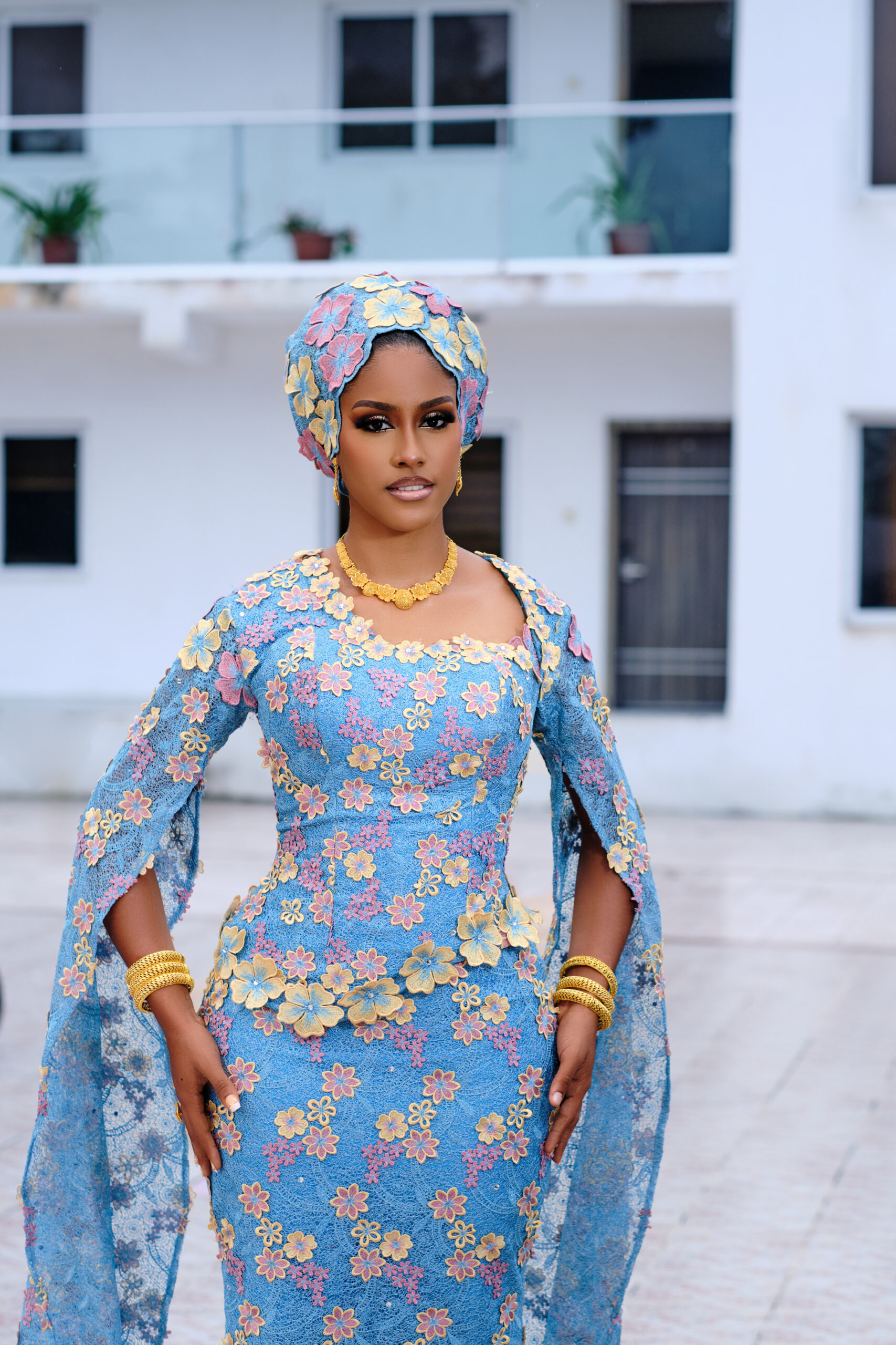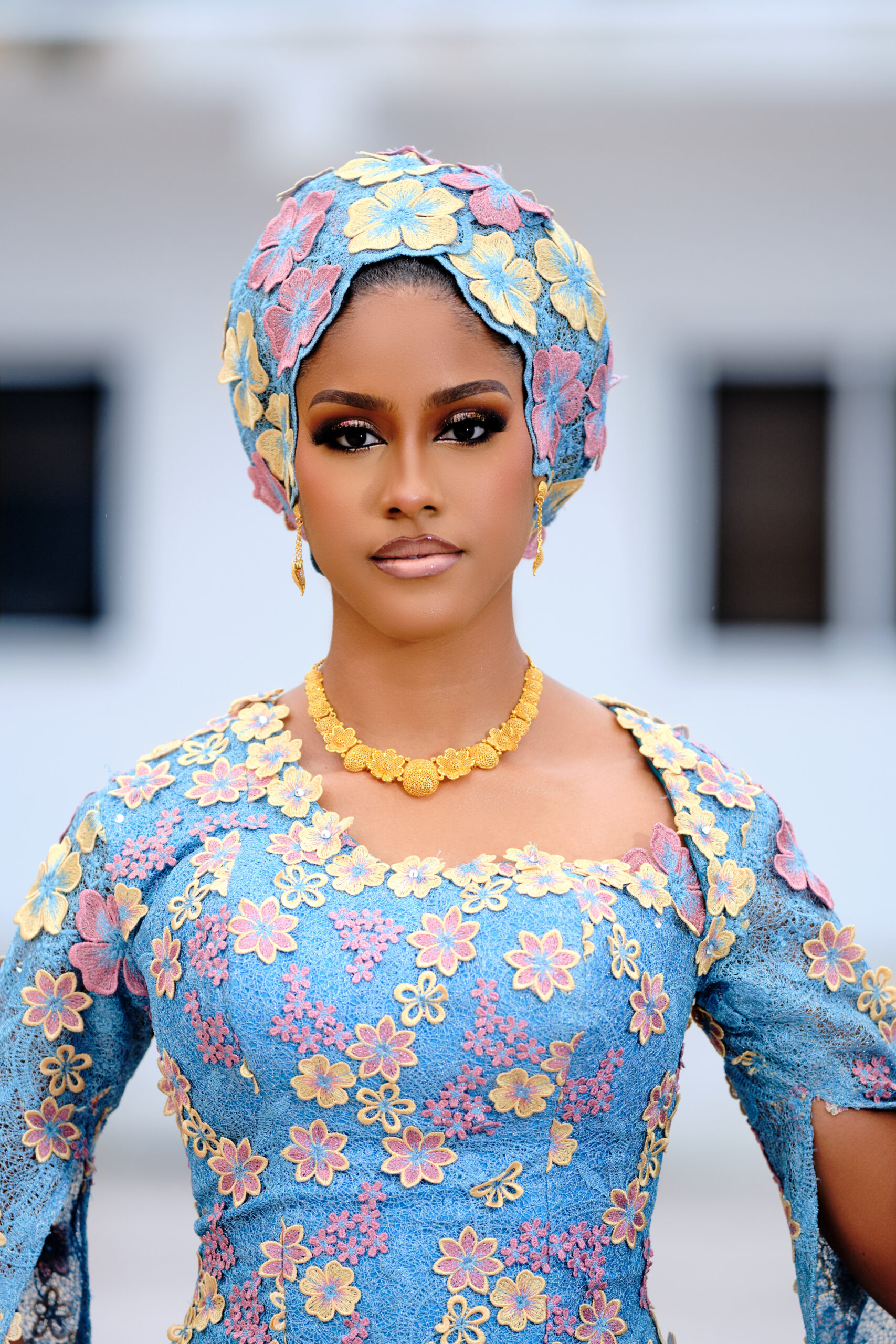 This gorgeous Northern bridal look by Oprah’s Cut is everything and more! The sky-blue lace dress, sprinkled with pink and yellow floral patterns, paired with those dramatic cape sleeves that scream main character only! To top it all off, Adufe Gele delivers perfection with a chic floral turban style that ties the whole look together. And let’s not forget David’s Touch, who brought the glam with soft, smoky eyes and a flawless glow that screams bridal beauty goals. It’s classy, it’s cultural, and it’s the ultimate inspo for brides ready to own every moment with sheer elegance!