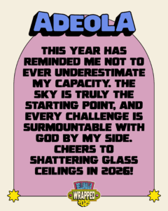 This year has reminded me not to ever underestimate my capacity. The sky is truly the starting point, and every challenge is surmountable with God by my side. Cheers to shattering glass ceilings in 2026!