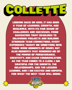 Looking back on 2025, it has been a year of learning, growth, and resilience, with its fair share of challenges and successes. From navigating tight deadlines to delivering projects and building stronger team connections, every experience taught me something new. There were moments of doubt, but also moments that reminded me of the power of perseverance, creativity, and clear communication. As the year comes to a close, I am grateful for the growth, the relationships, and the lessons learned, and I am excited and hopeful for what the next year will bring.