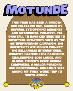 This year has been a smooth and fulfilling one, marked by several eye-opening moments and meaningful projects. I’m grateful to have contributed to impactful initiatives such as the #StopHPVForHer campaign, the #MentalityWithEbuka project, the BellaNaija International Women’s Day/High-Tea campaign, Goalkeepers 2025 Lagos, and Global Citizen’s Move Afrika campaigns. A major personal and professional highlight was taking my first work trip to South Africa.