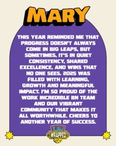 This year reminded me that progress doesn’t always come in big leaps, but sometimes, it’s in quiet consistency, shared excellence, and wins that no one sees. 2025 was filled with learning, growth and meaningful impact. I’m so proud of the incredible BN team and our vibrant community that makes it all worthwhile. Cheers to another year of success. 🥂